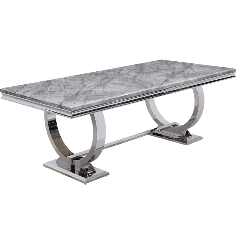 Description This double ring stainless steel base with clear grey and white rectangular and oval shape top dining table is perfect for dining spaces and gives your area a modern look. It has a tabletop with a white and black marble finish. This table is a great sculptural piece to add to your home.