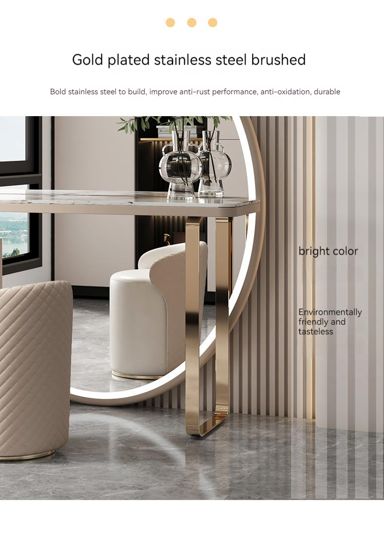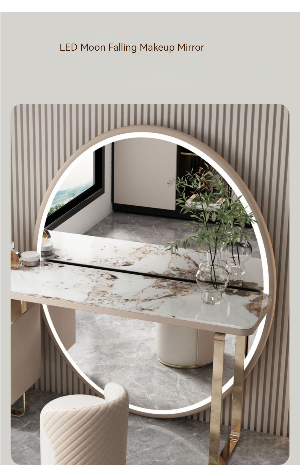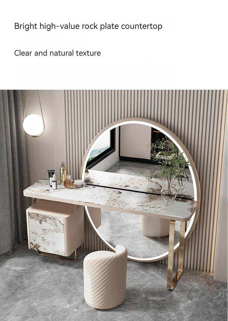 1. Modern Sintered Stone Table Top: Crafted with precision and innovation, the sintered stone table top boasts a luxurious champagne finish that exudes sophistication. This high-quality material is not only visually appealing but also durable and resistant to scratches and stains. Its smooth surface provides the perfect canvas for your makeup and beauty essentials, allowing you to create your signature looks with ease.