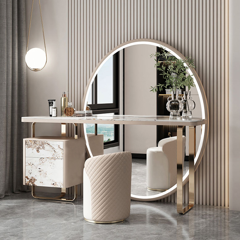 Introducing our exquisite Modern Sintered Stone Table Top Champagne Makeup Vanity Set, designed to elevate your beauty routine and add a touch of elegance to your space. This all-inclusive set includes a stunning table top, a convenient 2-drawer side cabinet, a stand-up full body mirror, and a round stool, ensuring that all your vanity needs are met in style. Let us take a closer look at each component: