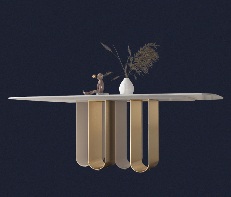 In summary, the Modern Sintered Stone 4 Curved Stainless Steel Base Dining Table is a statement of modern design and luxury. Its stainless steel base, sintered stone tabletop, and attention to detail create a visually captivating and sophisticated centerpiece for your dining area. With its impeccable craftsmanship and contemporary appeal, this table embodies both style and functionality, offering a memorable and elevated dining experience.