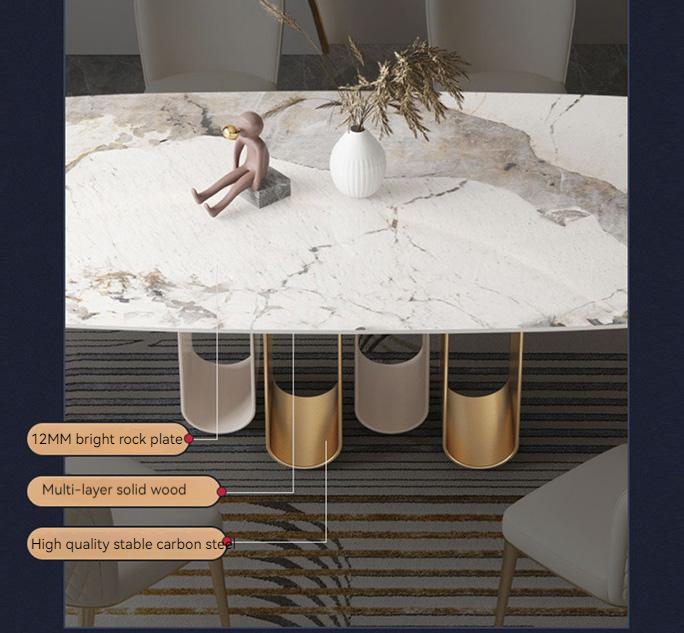 Safety to Use The stability of the safety load-bearing design prevents it from rolling over. The bottom of the dining table with micro-color rock board is bonded with solid wood multi-layer board, the frame is secured with screws, and the entire table is fixed with high-strength screws between the table top and the panel, so it will not move no matter how much it is shook.