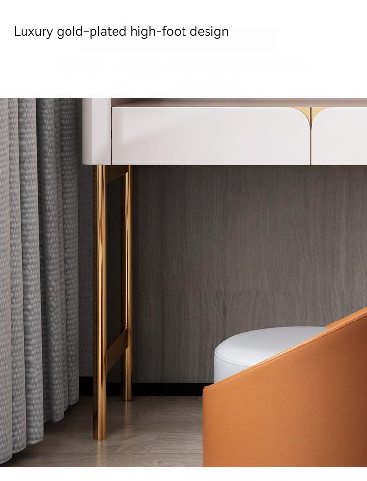 Completing the set is a comfortable and elegant round chair that adds a touch of luxury and comfort. The chair’s cushioning provides excellent support, allowing you to sit comfortably while getting ready for the day or preparing for a night out.