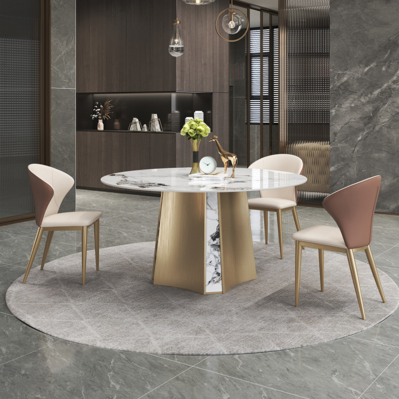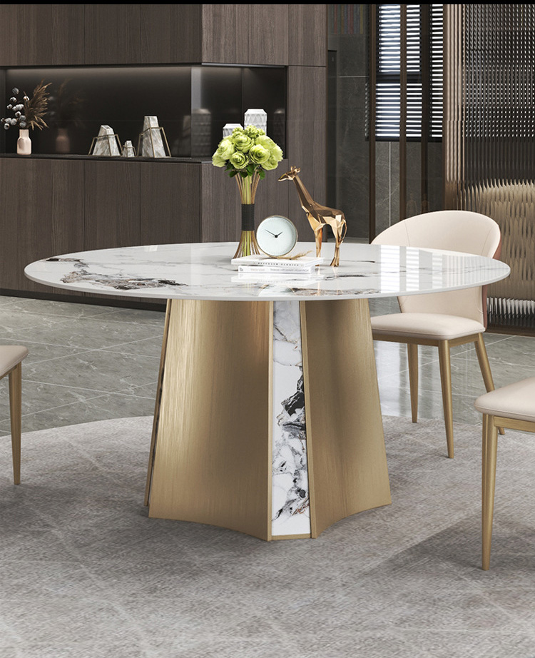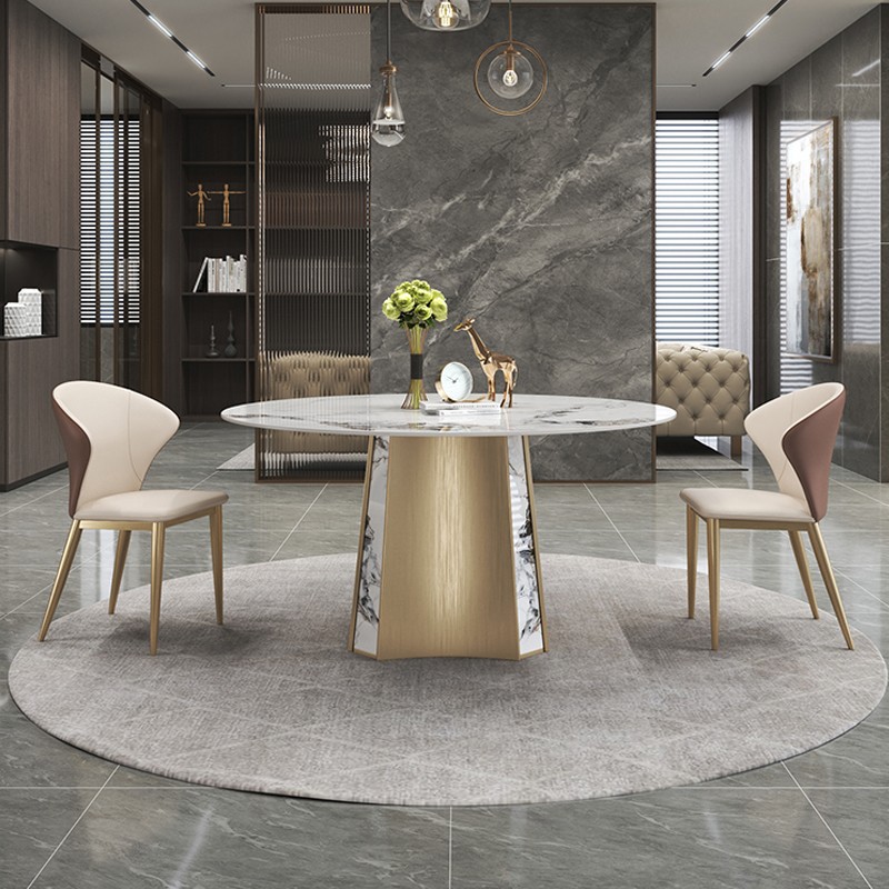 Description This white sintered stone dining table is perfect for dining spaces and gives your area a modern look. It has a tabletop with white and black veining it stands on a sintered stone and gold brush designed base. This table is a great sculptural piece to add to your home.