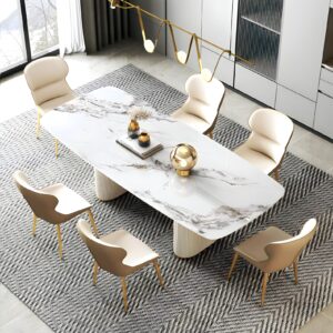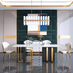 | Description | This white sintered stone dining table is perfect for dining spaces and gives your area a modern look. It has a tabletop with white and black veining it stands on a sintered stone and gold brush designed base. This table is a great sculptural piece to add to your home. | |||||