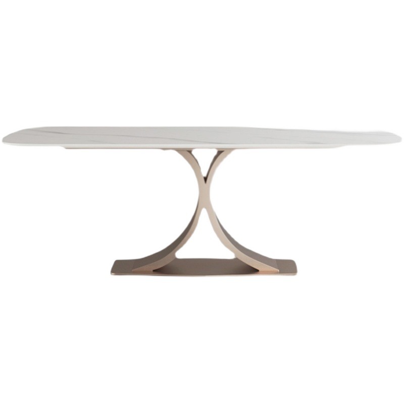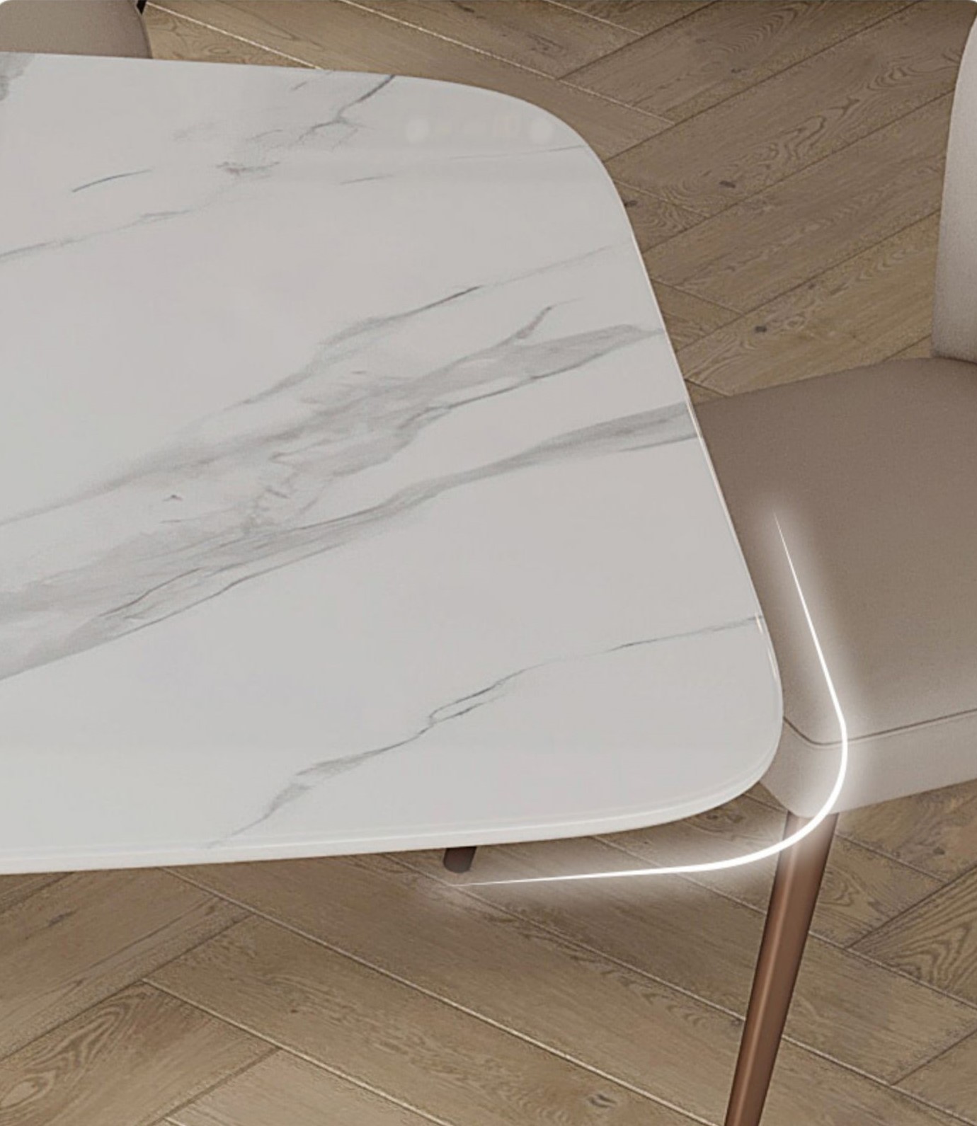The tabletop features a mesmerizing sintered stone surface, carefully selected for its durability, beauty, and unique characteristics. Sintered stone, known for its exceptional strength and resistance to heat, scratches, and stains, offers both practicality and exquisite aesthetics. The stone’s texture and veining patterns mimic the natural beauty of marble or granite, adding a touch of timeless elegance to the table.