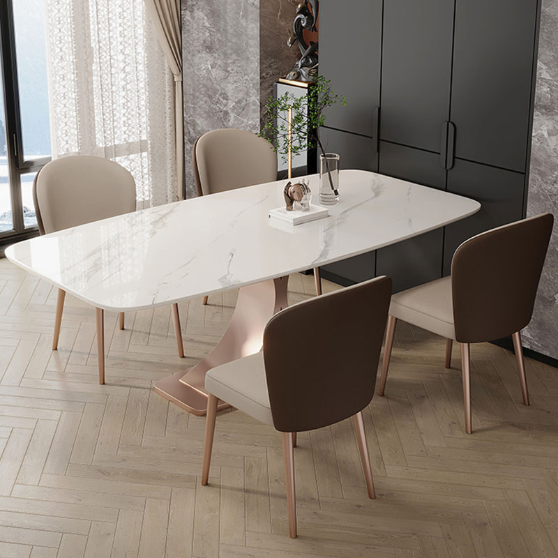To complete the luxurious ensemble, consider pairing the table with contemporary and comfortable dining chairs upholstered in sumptuous fabrics or sleek leather. The juxtaposition of the Titanium Gold Wire Drawing base and the sintered stone surface with the elegance of the seating options creates a cohesive and harmonious dining space.